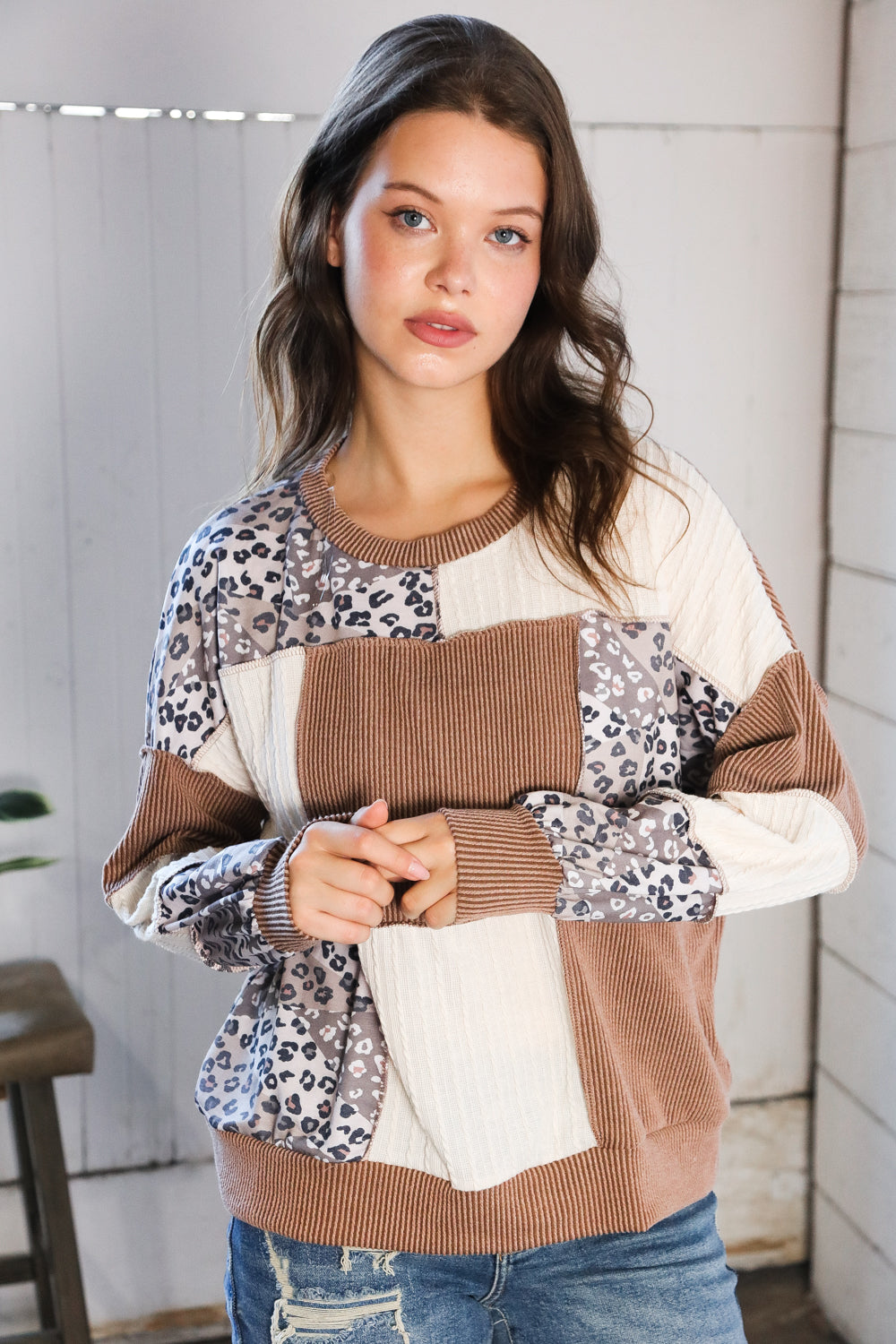 This sweater is such a fun mix of cozy and trendy. It’s got the patchwork look with blocks of ribbed knit, cable knit, and leopard print all pieced together in warm neutral shades. The fabric is soft and has a nice stretch, so it feels really comfortable on. The sleeves are a little roomy with fitted cuffs at the wrist which makes it easy to push up if you want. Just too cute!
